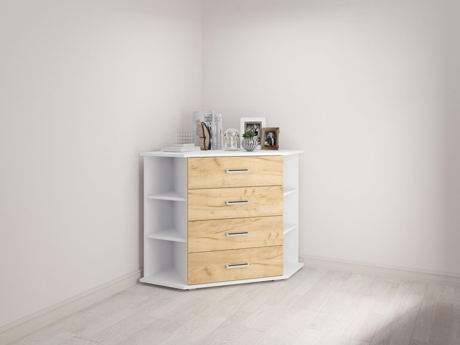 — Угловой комод с открытыми полками и выдвижными ящиками