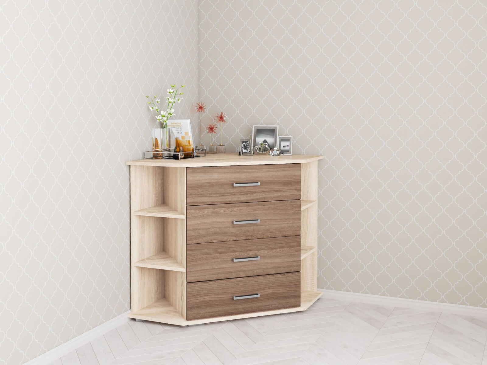 — Угловой комод с открытыми полками и выдвижными ящиками